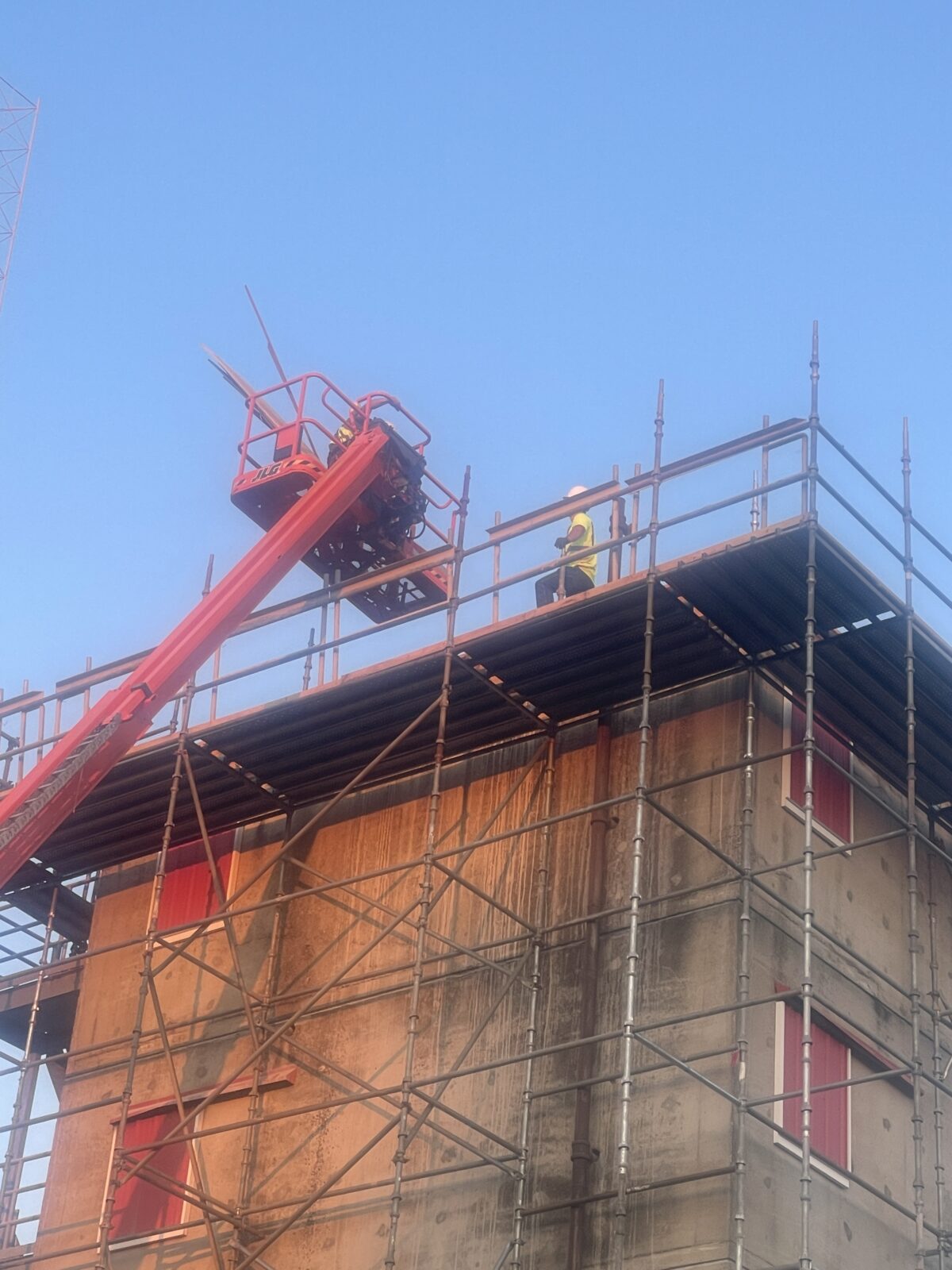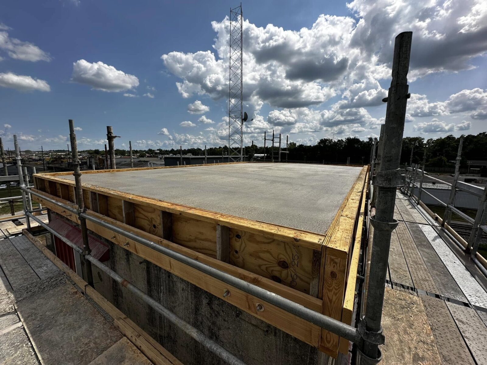 The challenge: Removing an existing structural concrete roof and pouring a new concrete roof five stories in the air. To ensure our crews stayed safe during work, we had a scaffold platform built on all four sides of the building.